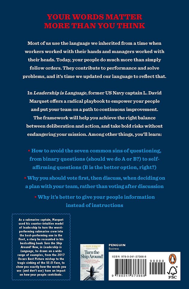 In his last book, Turn the Ship Around!, Marquet told the incredible story of abandoning command-and-control leadership on his submarine and empowering his crew to turn the worst performing submarine to the best performer in the fleet. Now, with Leadership is Language he gives businesspeople the tools they need to achieve such transformational leadership in their organizations.
