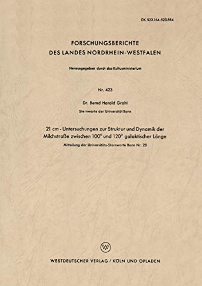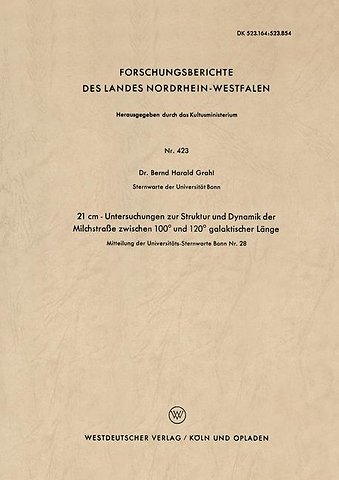 The presented 21 cm-observations consist of 61 line profiles of points 0 0 0 0 0 between 100 and 120 galactic length at + 2 , 0 , - 2 galatic lati tude each measured about three times. The whole calibrated results, reduced to the local standard of rest, are compiled in the second appendix. The reduction of these temperature-profiles for statistical motions of HI-clouds was performed by an additive analysis for gaussian components. Table 1 contains the parameters of all components of the whole program. The standard deviation mainly varies between a = 4,6 to 6,3 km/sek. Using the dates for optical depth and internal statistical motions of an individual cloud found by absorption measurements from MULLER (1957), a figure ~ was derived from the area of each Gauß component, which is a measure for the coverage of the antenna-main lobe with clouds. Further from this an average for the density of HI-atoms is derived for each component. The velocities of the components (group-motions of the clouds) are plotted against the galactic length in Fig. 14 and 15. Using the model of M. SCHMIDT (1956) the curves for constant distance r from the sun are drawn into this diagram. But a careless conversion of the measured velocities into polar-coordinates r,l would bring strange radial struc tures. This leads to the conclusion that the motions are not fully caused by differential rotation. The observed peculiar motions range from 8 to 15 km/sek.