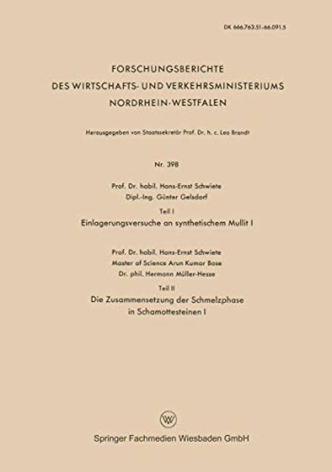 Gliederung.- I.- 1. Einlagerungsversuche an synthetischem Mullit.- 2. Literaturverzeichnis.- II.- 1. Einleitung und Literaturübersicht.- 2. Lösungsversuche an Schamottesteinen.- 3. Chemische Untersuchung der Rückstände und Lösungen.- 4. Folgerungen aus den Analysenergebnissen.- 5. Untersuchung der Schmelzphase von bei verschiedenen Temperaturen gebrannten Schamottesteinen.- 6. Vergleich bisheriger Ergebnisse mit neueren Arbeiten.- 7. Die quantitative Bestimmung von Mullit in Schamottesteinen.- 8. Zusammenfassung.- 9. Literaturverzeichnis.