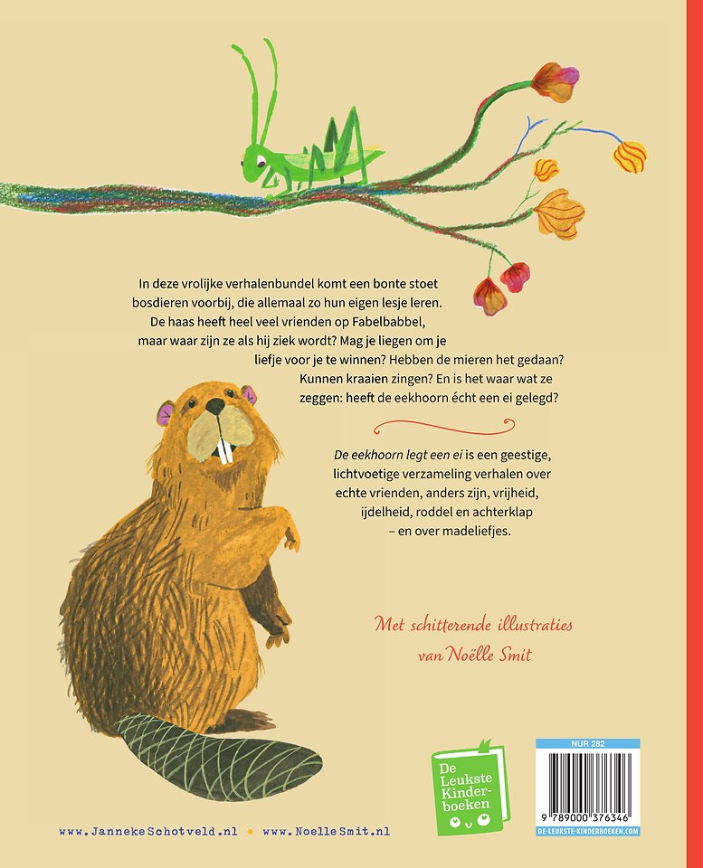 De eekhoorn legt een ei is een geestige, lichtvoetige verzameling fabels over echte vrienden, over anders-zijn, vrijheid, ijdelheid, roddel en achterklap en over madeliefjes. Noëlle Smit maakte de schitterende illustraties. Een feest om voor te lezen vanaf 6 jaar of zelf te lezen vanaf 8 jaar.