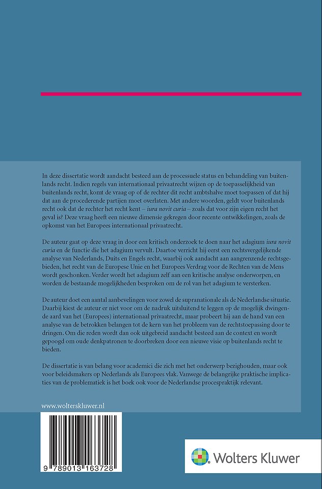 Door de voortschrijdende europeanisering van het internationaal privaatrecht, is het leerstuk van de toepassing van buitenlands recht in de civiele procedure weer in de schijnwerpers komen te staan. De vraag rijst of het Europese karakter van regels van internationaal privaatrecht de rechter dwingt het aangewezen recht ambtshalve toe te passen. Geldt het klassieke leerstuk iura novit curia – de rechter kent het recht – ook voor buitenlands recht? Het proefschrift Iura novit curia en buitenlands recht poogt een nieuwe visie te werpen op deze kwestie. De auteur is erin geslaagd de klassieke problematiek vanuit diverse vernieuwende perspectieven te beschouwen, zonder vast te zitten in oude denkpatronen. De titel draagt hiermee bij aan de actuele discussie over de taakverdeling tussen rechter en partijen.