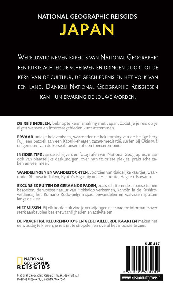 National Geographic Reisgids Japan is een exclusieve gids met sublieme fotografie die u meeneemt naar de bekende en minder bekende bezienswaardigheden. De experts van National Geographic nemen een kijkje achter de schermen en dringen door tot de kern van de cultuur, de geschiedenis en het volk van het land. Bezoek met deze National Geographic Reisgids Japan bekende sites als de majestueuze Fuji-vulkaan, keizerlijk Kioto, hypermodern en flitsend Tokio, de schitterende natuur van Hokkaido en vele andere schitterende Japanse bezienswaardigheden. De uitgebreide kennismaking met Japan, het overzicht met belevenissen die je niet mag missen, de insider tips, de excursies buiten de gebaande paden en de reiswijzer met hotels en restaurants en de handige kaarten maken de gids compleet. Speciaal aanbevolen voor natuur- en cultuurliefhebbers!
