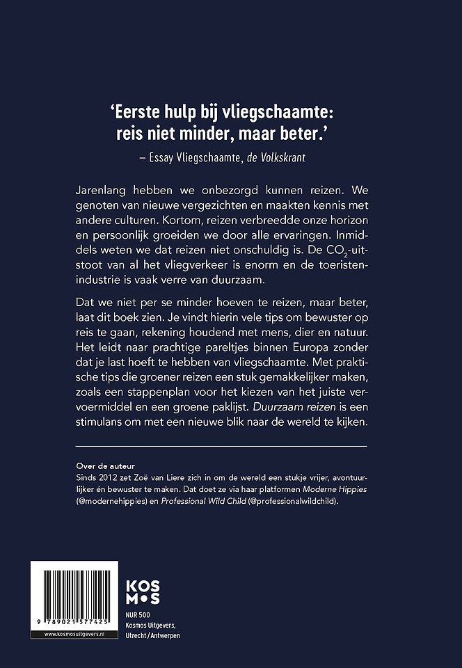 ‘Duurzaam reizen’ van Professional Wild Child Zoë van Liere is hét boek voor iedereen die duurzaam en verantwoord op reis wil gaan. Het leidt naar prachtige pareltjes binnen Europa zonder dat je last hoeft te hebben van vliegschaamte. Met praktische tips die groener reizen een stuk gemakkelijker maken, zoals een groene paklijst, een stappenplan voor het kiezen van het juiste vervoermiddel en feitelijke informatie over de uitstoot die we maken. Een stimulans om met een nieuwe blik naar de wereld te kijken.
