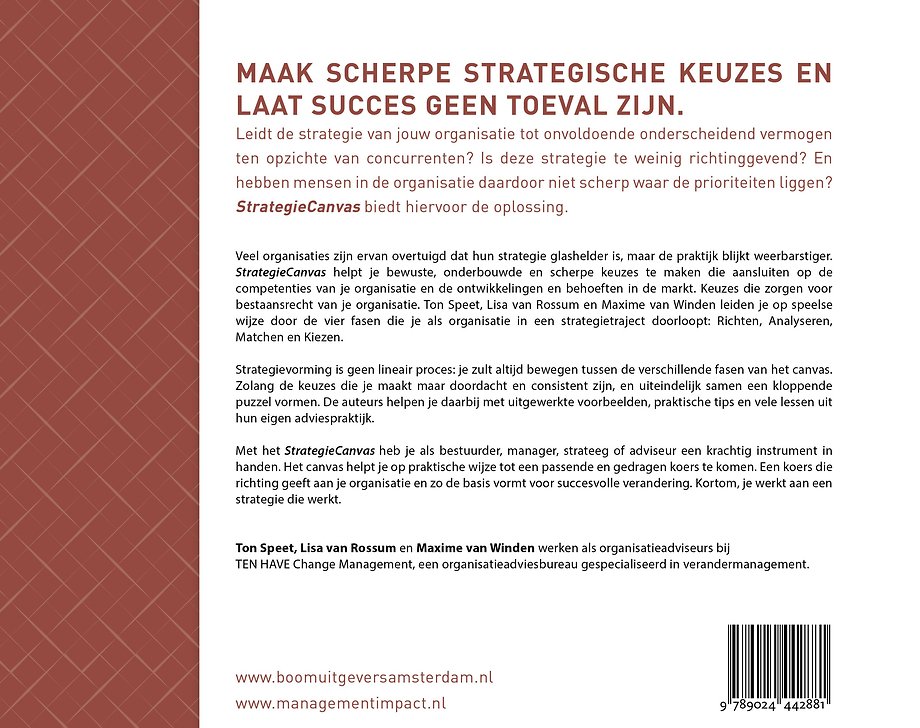 Veel organisaties zijn ervan overtuigd dat hun strategie glashelder is, maar de praktijk blijkt weerbarstiger. StrategieCanvas helpt je bewuste, onderbouwde en scherpe keuzes te maken die aansluiten op de competenties van je organisatie en de ontwikkelingen en behoeften in de markt. Keuzes die zorgen voor bestaansrecht van je organisatie. Ton Speet, Lisa van Rossum en Maxime van Winden leiden je op speelse wijze door de vier fasen die je als organisatie in een strategietraject doorloopt: Richten, Analyseren, Matchen en Kiezen.