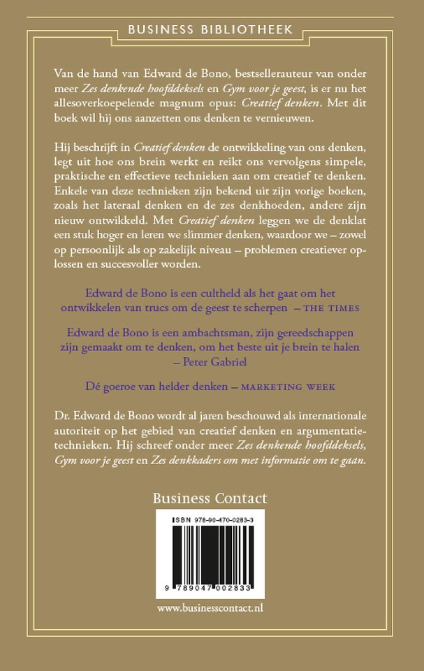 Meer over Edward de BonoVan de hand van Edward de Bono, bestsellerauteur van onder meer 'Zes denkende hoofddeksels' en 'Gym voor je geest', is er nu het allesoverkoepelende magnum opus: 'Creatief denken'. Met dit boek wil hij ons aanzetten ons denken te vernieuwen.