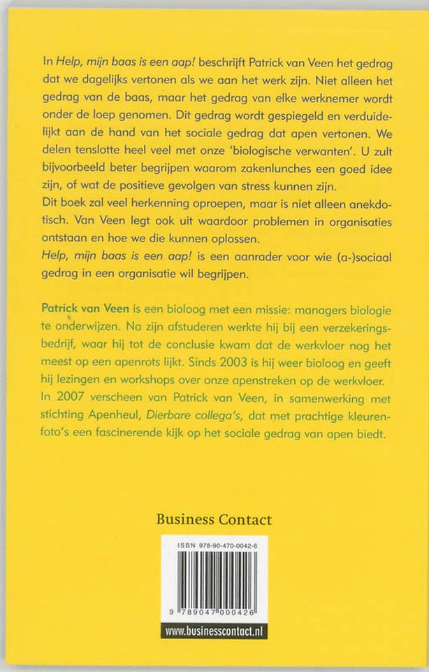 Meer over Patrick van VeenIn 'Help, mijn baas is een aap!' beschrijft bioloog Patrick van Veen het gedrag dat we dagelijks vertonen als we aan het werk zijn. Niet alleen de baas, maar elke werknemer wordt onder de loep genomen. Dit gedrag wordt verduidelijkt aan de hand van een vergelijking met het sociale gedrag dat apen vertonen.