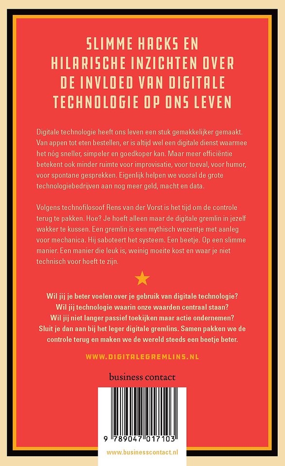 Volgens technofilosoof Rens van der Vorst is het tijd om de controle terug te pakken. Hoe? Je hoeft alleen maar de digitale gremlin in jezelf wakker te kussen. Een gremlin is een mythisch wezentje met aanleg voor mechanica. Hij saboteert het systeem. Een beetje. Op een slimme manier. Een manier die leuk is, weinig moeite kost en waar je niet technisch voor hoeft te zijn.