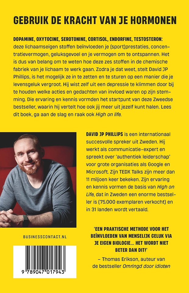 David JP Phillips is een internationaal succesvolle spreker uit Zweden. Hij werkt als communicatie-expert en spreekt over ‘authentiek leiderschap’ voor grote organisaties als Google en Microsoft. Zijn TEDX Talks zijn meer dan 11 miljoen keer bekeken. Zijn ervaring en kennis vormen de basis van High on Life, dat in Zweden een enorme bestseller is en in 31 landen wordt vertaald.