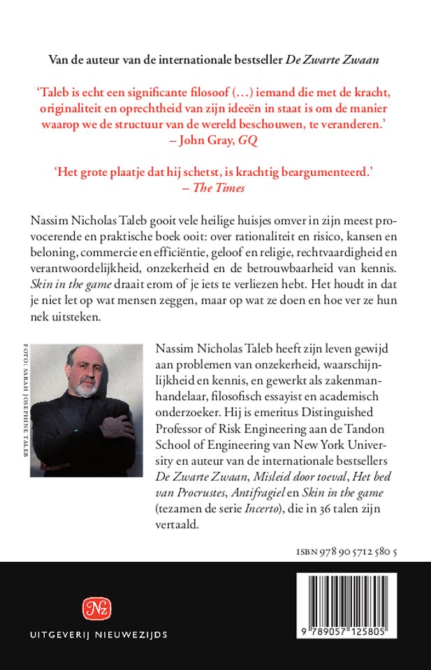 Meer over Nassim Nicholas Taleb'Skin in the game' betekent dat je niet let op wat mensen zeggen, maar op wat ze doen, en hoe ver ze hun nek uitsteken. Het draait erom of je iets te verliezen hebt en raakt alle facetten van ons leven.