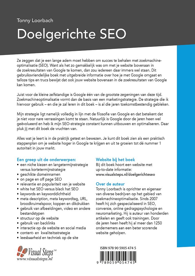 Meer over Tonny LoorbachZe zeggen dat je een lange adem moet hebben om succes te behalen met zoekmachineoptimalisatie (SEO). Want als het zo gemakkelijk was om met je website bovenaan in de zoekresultaten van Google te komen, dan zou iedereen daar immers wel staan. Dit gebruiksvriendelijke boek met uitgebreide informatie over hoe je met Google omgaat en talloze tips en trucs bewijst dat ook jouw website bovenaan in de zoekresultaten van Google kan komen.