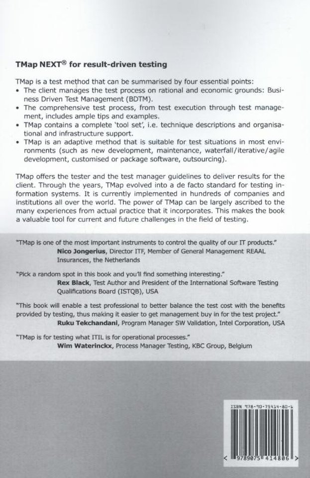 Voor de tester en de testmanager biedt TMap een leidraad om binnen de context resultaat te leveren voor de opdrachtgever. TMap heeft zich in de afgelopen jaren ontwikkeld tot dé standaard voor het testen van informatiesystemen. Het wordt momenteel toegepast in honderden bedrijven en instellingen, waaronder de meeste Nederlandse en Belgische banken, verzekeringsmaatschappijen, pensioenfondsen en overheidsinstellingen. De kracht van TMap kan voor een groot deel worden toegeschreven aan de vele praktijkervaringen die er in zijn verwerkt. Het boek is daarmee een waardevol hulpmiddel voor de huidige en toekomstige uitdagingen op testgebied.