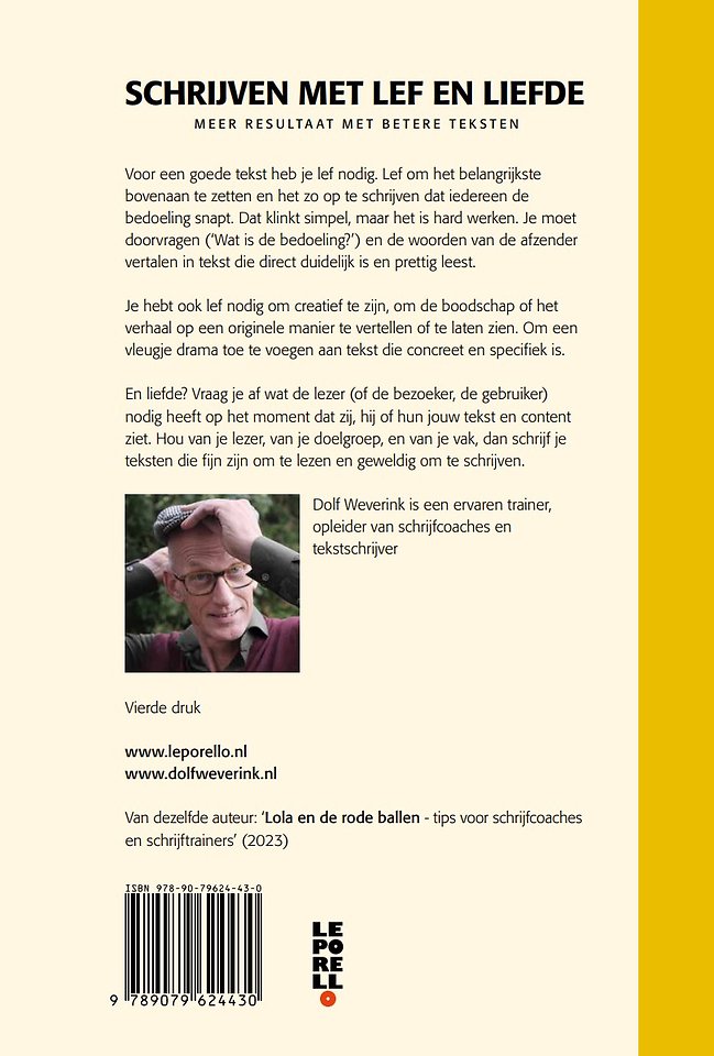 Dolf Weverink is schrijfcoach, schrijftrainer, opleider en tekstschrijver. In zijn aanpak ontmoet Socrates Maria Montessori en Sarina Wiegman. Leer mensen het zelf te doen (goede teksten en content maken) door de juiste vragen te stellen en vaardigheden te leren. En dan veel oefenen. Zo worden je teksten aantrekkelijk, overtuigend, duidelijk en correct.