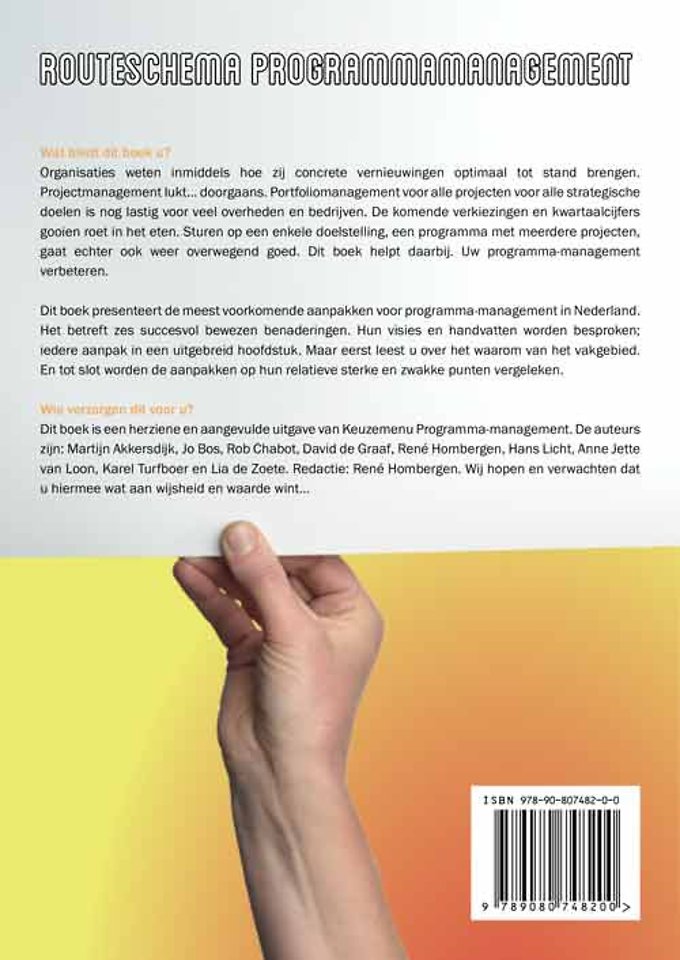 Dit boek presenteert de meest voorkomende aanpakken voor programma-management in Nederland. Het betreft zes succesvol bewezen benaderingen. Hun visies en handvatten worden besproken; iedere aanpak in een uitgebreid hoofdstuk. Maar eerst leest u over het waarom van het vakgebied. En tot slot worden de aanpakken op hun relatieve sterke en zwakke punten vergeleken.