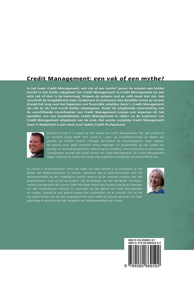 In het boek 'Credit Management, een vak of een mythe?' geven de auteurs een helder inzicht in het brede vakgebied van credit management. Is credit management nu een echt vak of niet, is de hamvraag. Volgens de auteurs wel en zelfs meer dan dat. Het verschaft de mogelijkheid meer rendement te realiseren met dezelfde omzet en tevens draagt het zorg voor het beperken van financiële zakelijke risico's. Credit management als vak en als tool wordt helder uiteengezet. Naast de uitgebreide verwoording van de verschillende invalshoeken van credit management komen ook aspecten als het opstellen van een kredietbeleid, credit management in cijfers en de toekomst van credit management uitgebreid aan de orde. Het eerste complete credit management boek in Nederland is een must voor iedere credit professional.