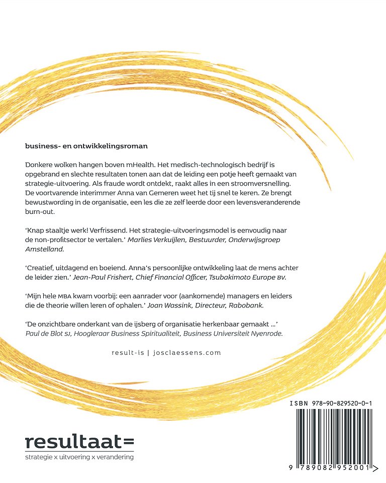 Donkere wolken hangen boven mHealth. Het medisch-technologisch bedrijf is opgebrand en slechte resultaten tonen aan dat de leiding een potje heeft gemaakt van strategie-uitvoering. Als fraude wordt ontdekt, raakt alles in een stroomversnelling. De voortvarende interimmer Anna van Gemeren weet het tij snel te keren. Ze brengt bewustwording in de organisatie, een les die ze zelf leerde door een levensveranderende burn-out.