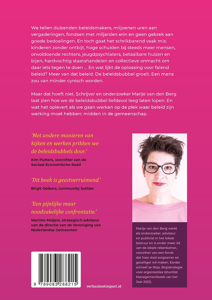 Maar dat hoeft niet. Schrijver en onderzoeker Marije van den Berg laat zien hoe we de beleidsbubbel liefdevol leeg laten lopen. En wat het oplevert als we gaan werken op de plek waar beleid zijn werking moet hebben: midden in de gemeenschap.