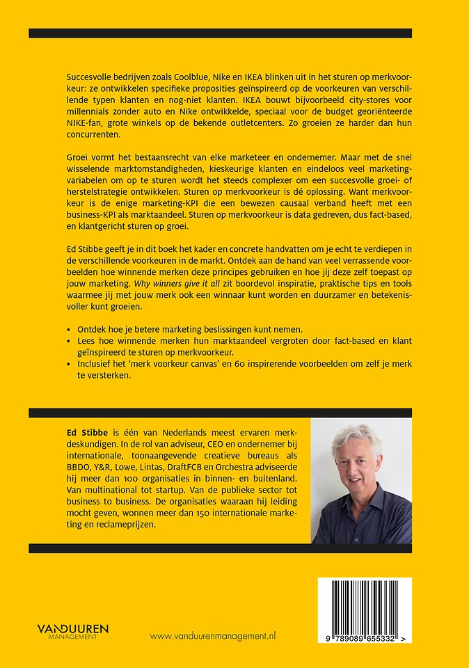 Ed Stibbe is een merk- en marketingexpert met ruim 30 jaar ervaring als adviseur en CEO van internationale, toonaangevende en prijswinnende merkadviesbureaus als o.a. Lintas, Lowe, en DraftFCB. Via zijn bedrijf ES&Company adviseert hij bedrijven, van scale-up tot multinational, op het gebied van branding en communicatie. Hij schreef eerder het succesvolle marketing boek 'Why winners give it all'.