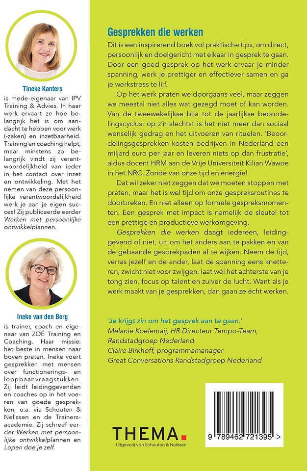Gesprekken die werken daagt iedereen, leidinggevend of niet, uit om het anders aan te pakken en van de gebaande gesprekpaden af te wijken. Neem de tijd, verras jezelf en de ander, laat de spanning eens knetteren, zwicht niet voor zwijgen, laat wél het achterste van je tong zien, focus op talent en zuiver de lucht. Want als je werk maakt van je gesprekken, dan gaan ze écht werken.