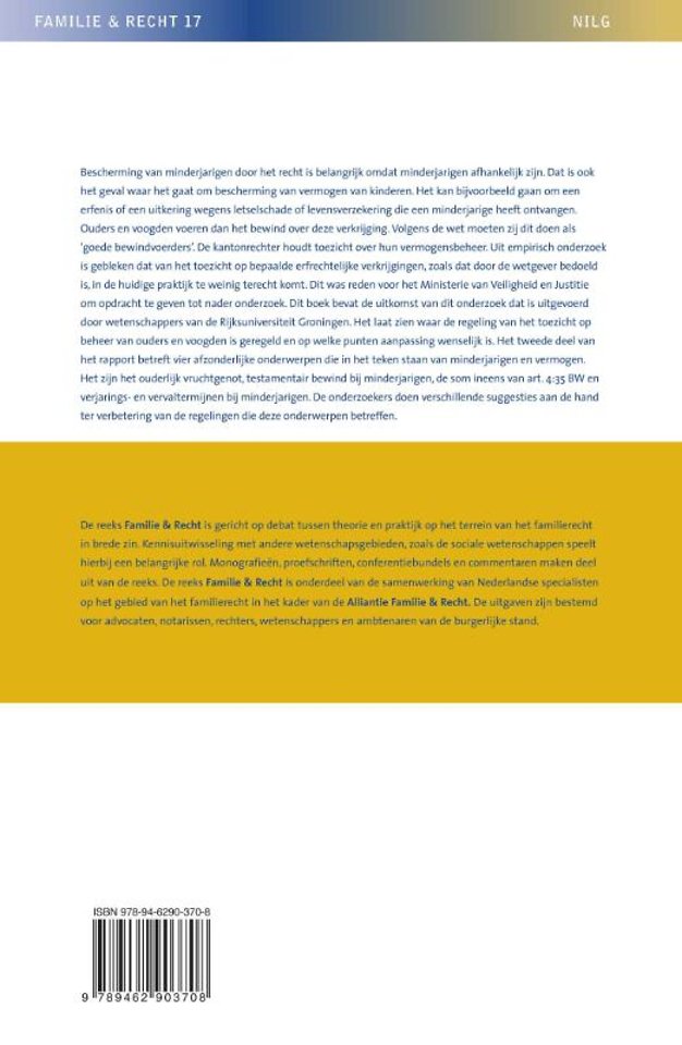 Dit boek bevat de uitkomst van dit onderzoek dat is uitgevoerd door wetenschappers van de Rijksuniversiteit Groningen. Het laat zien waar de regeling van het toezicht op beheer van ouders en voogden is geregeld en op welke punten aanpassing wenselijk is. Het tweede deel van het rapport betreft vier afzonderlijke onderwerpen die in het teken staan van minderjarigen en vermogen. Het zijn het ouderlijk vruchtgenot, testamentair bewind bij minderjarigen, de som ineens van art. 4:35 BW en verjarings- en vervaltermijnen bij minderjarigen. De onderzoekers doen verschillende suggesties aan de hand ter verbetering van de regelingen die deze onderwerpen betreffen.
