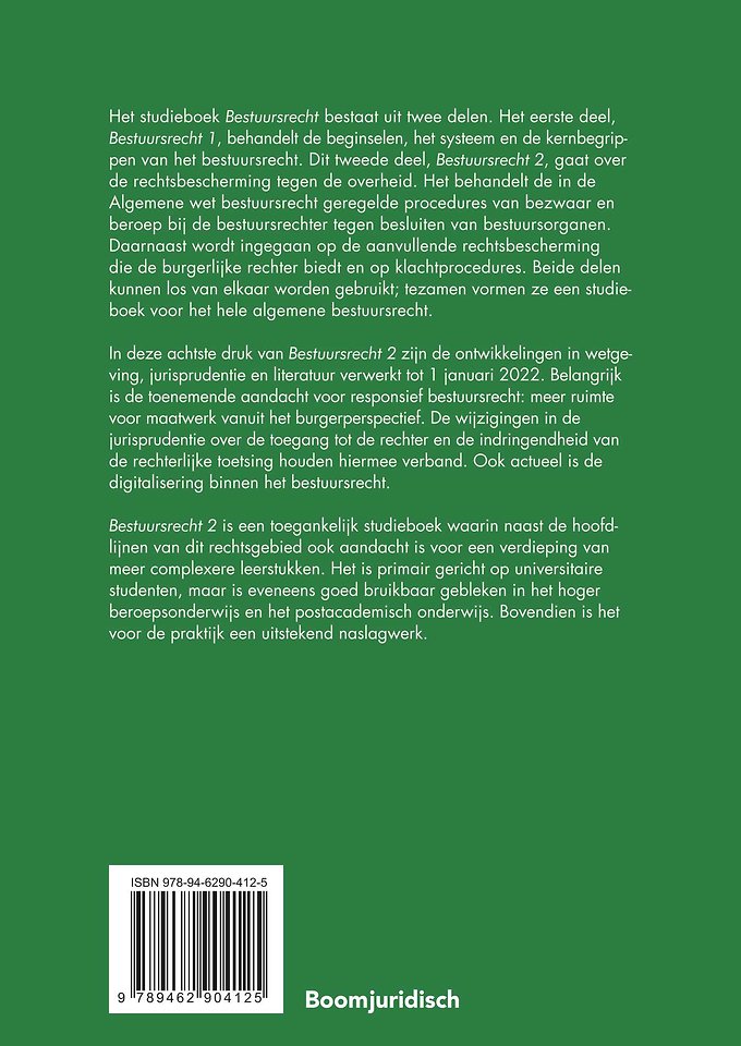 In deze achtste druk van Bestuursrecht 2 zijn de ontwikkelingen in wetgeving, jurisprudentie en literatuur verwerkt tot 1 januari 2022. Belangrijk is de toenemende aandacht voor responsief bestuursrecht: meer ruimte voor maatwerk vanuit het burgerperspectief. De wijzigingen in de jurisprudentie over de toegang tot de rechter en de indringendheid van de rechterlijke toetsing houden hiermee verband. Ook actueel is de digitalisering binnen het bestuursrecht. Bestuursrecht 2 is een toegankelijk studieboek waarin naast de hoofdlijnen van dit rechtsgebied ook aandacht is voor een verdieping van meer complexere leerstukken.