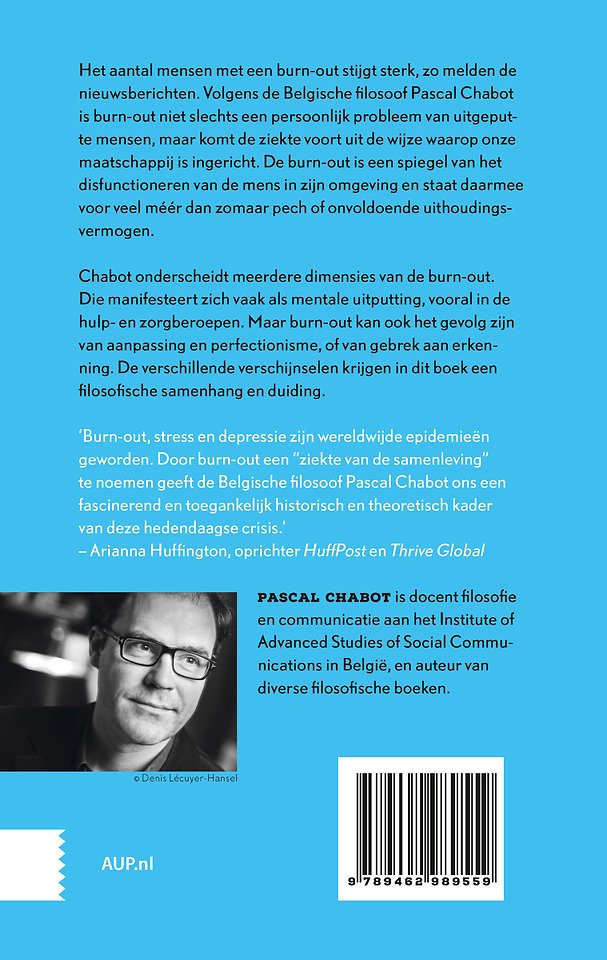 'Burn-out, stress en depressie zijn wereldwijde epidemieën geworden. Door burn-out een 'ziekte van de samenleving' te noemen geeft de Belgische filosoof Pascal Chabot ons een fascinerend en toegankelijk historisch en theoretisch kader van deze moderne crisis.' - Arianna Huffington, oprichter HuffPost en Thrive Global