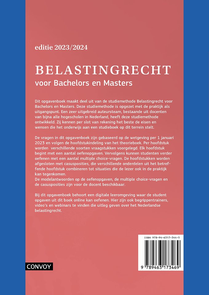 Dit opgavenboek maakt deel uit van de studiemethode Belastingrecht voor Bachelors en Masters. Deze studiemethode is opgezet met de praktijk als uitgangspunt. Een zeer uitgebreid auteursteam, bestaande uit docenten van bijna alle hogescholen in Nederland, heeft deze studiemethode ontwikkeld. Zij kennen per slot van rekening het beste de eisen en wensen die het onderwijs aan een studieboek op dit terrein stelt.