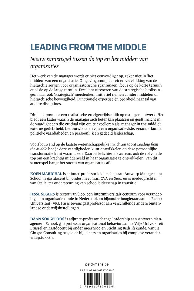Meer over de auteursHet werk van de manager wordt er niet eenvoudiger op, zeker niet in ‘het midden’ van een organisatie. Omgevingscomplexiteit en vervlakking van de hiërarchie zorgen voor organisatorische paradoxen: focus op de korte termijn en visie op de lange termijn. Excellent uitvoeren van de strategische beslissingen maar ook ‘strategisch’ meedenken. Initiatief nemen zonder middelen of hiërarchische bevoegdheid. Functionele expertise en openheid naar tal van andere disciplines. ‘Dit stond niet in mijn taakomschrijving’, verzuchten veel managers.