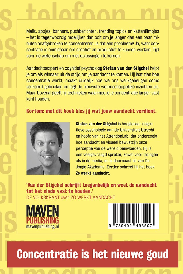 Aandachtsexpert en cognitief psycholoog Stefan van der Stigchel helpt je om als winnaar uit de strijd te komen. Hij laat zien hoe concentratie werkt, maakt duidelijk hoe we ons werkgeheugen soms verkeerd gebruiken en legt de nieuwste wetenschappelijke inzichten uit. Maar bovenal geeft hij technieken waarmee je je concentratie langer vast kunt houden.