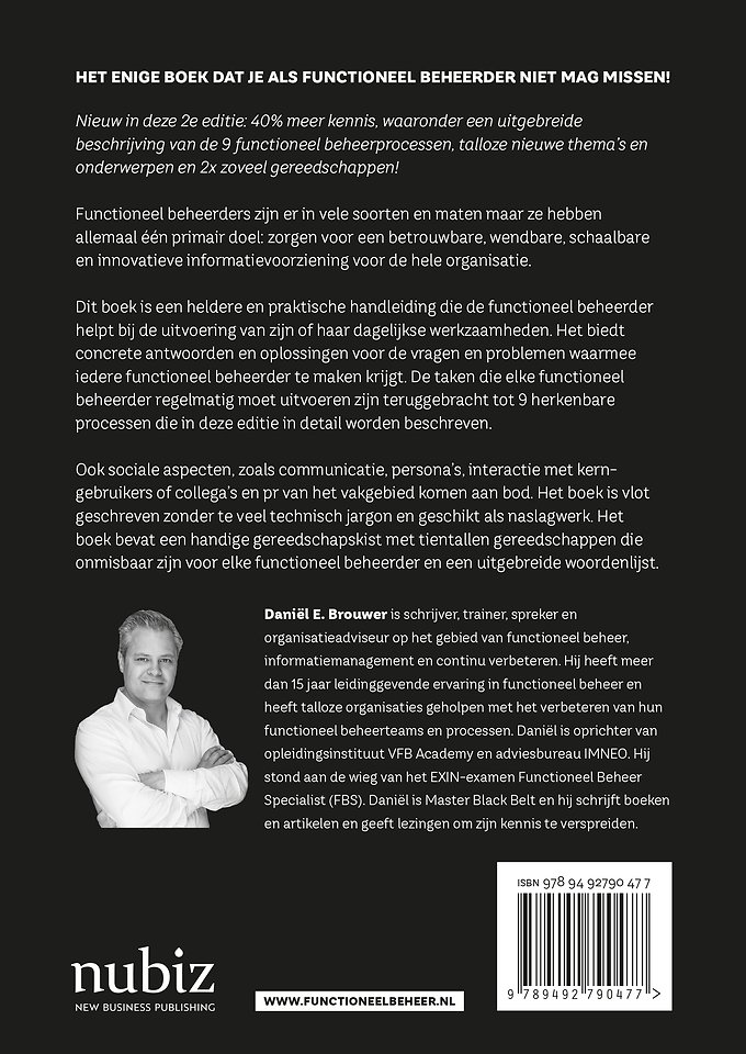 Daniël E. Brouwer is schrijver, trainer, spreker en organisatieadviseur op het gebied van informatiemanagement, functioneel beheer en continu verbeteren. Hij heeft meer dan 15 jaar leidinggevende ervaring en is oprichter van adviesbureau IMNEO en opleidingsinstituut VFB Academy. Daniël schrijft boeken en artikelen en geeft lezingen om zijn kennis te verspreiden.