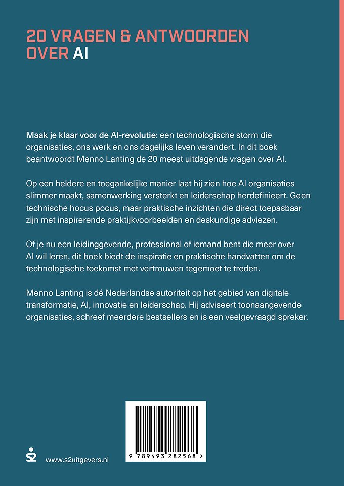 Meer over Menno LantingMaak je klaar voor de AI-revolutie: een technologische storm die organisaties, ons werk en ons dagelijks leven verandert. In dit boek beantwoordt Menno Lanting de 20 meest uitdagende vragen over AI. Op een heldere en toegankelijke manier laat hij zien hoe AI organisaties slimmer maakt, samenwerking versterkt en leiderschap herdefinieert. Geen technische hocus pocus, maar praktische inzichten die direct toepasbaar zijn met inspirerende praktijkvoorbeelden en deskundige adviezen. Of je nu een leidinggevende, professional of iemand bent die meer over AI wil leren, dit boek biedt de inspiratie en praktische handvatten om de technologische toekomst met vertrouwen tegemoet te treden. Over De disruptieparadox: Menno Lanting doet het weer. Een absolute bestseller. – Thomas Marzano, Global Head of Brand & Digital bij ASML Over Iedereen CEO: Lanting bouwt voort op zijn visionaire Connect! en wijst Nederland de weg in het nieuwe netwerktijdperk. – Ben Verwaayen, voormalig CEO bij British Telecom Over Uit het Transformatiemoeras: Lanting helpt jou en je team blijvende verandering te realiseren. Van digitale strategie naar businessstrategie in een digitale wereld met focus op échte gedragsverandering. – Martijn van Weele, Director Commercial Development Netherlands, Coca-Cola Europacific Partners Nederland B.V