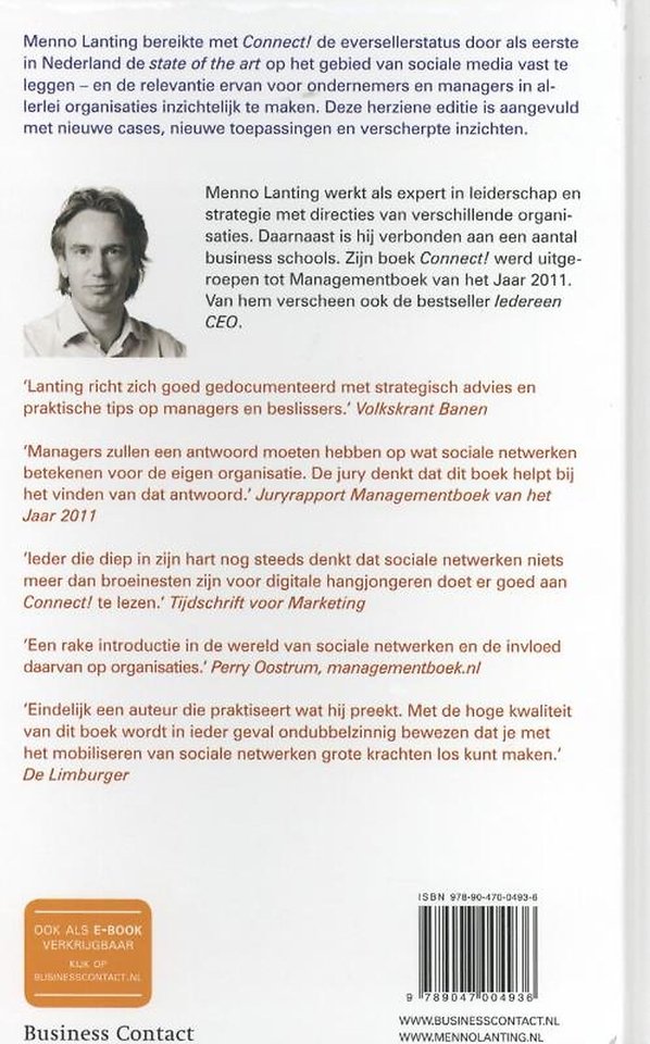 'Connect!' is een welgemeende aansporing. Want het is tijd om te handelen, en wel nu. Op basis van onderzoek onder managers in Nederland, en gesprekken met tientallen Nederlandse en Belgische bedrijven maakt Menno Lanting inzichtelijk welke stappen nodig zijn om die omslag te kunnen maken. Hij geeft concrete antwoorden op vragen als: Hoe kan ik zelf sociale netwerken gebruiken? Welke nieuwe business modellen ontstaan er? Op welke manier behouden we als organisatie aansluiting met de jonge, sociale netwerkgeneratie? Bedrijven kunnen een ontmoetingsplek worden voor connecties en creativiteit, maar dat gaat niet vanzelf. Daarom is 'Connect!' een must voor iedere leider, manager of professional.