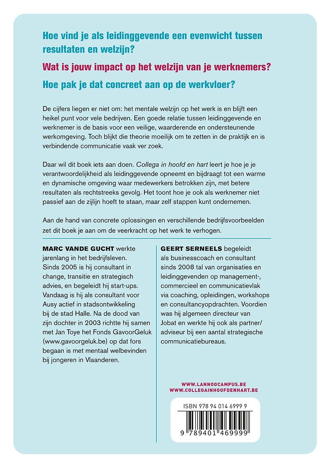 Daar wil dit boek iets aan doen. Collega in hoofd en hart leert je hoe je je verantwoordelijkheid als leidinggevende opneemt en bijdraagt tot een warme en dynamische omgeving waar medewerkers betrokken zijn, met betere resultaten als rechtstreeks gevolg. Het toont hoe je ook als werknemer niet passief aan de zijlijn hoeft te staan, maar zelf stappen kunt ondernemen.