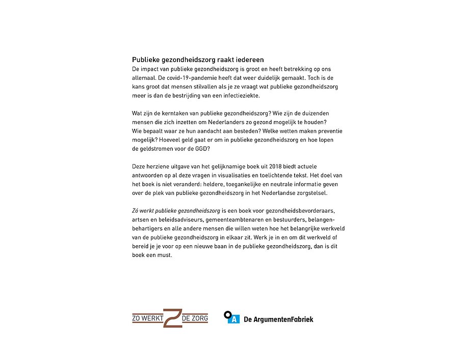 Zó werkt publieke gezondheidszorg is een boek voor iedereen die met publieke gezondheidszorg te maken heeft: van gemeenteambtenaren en bestuurders, tot beleidsadviseurs, artsen, belangenbehartigers en alle andere mensen die willen weten hoe dit belangrijke werkveld in elkaar steekt.